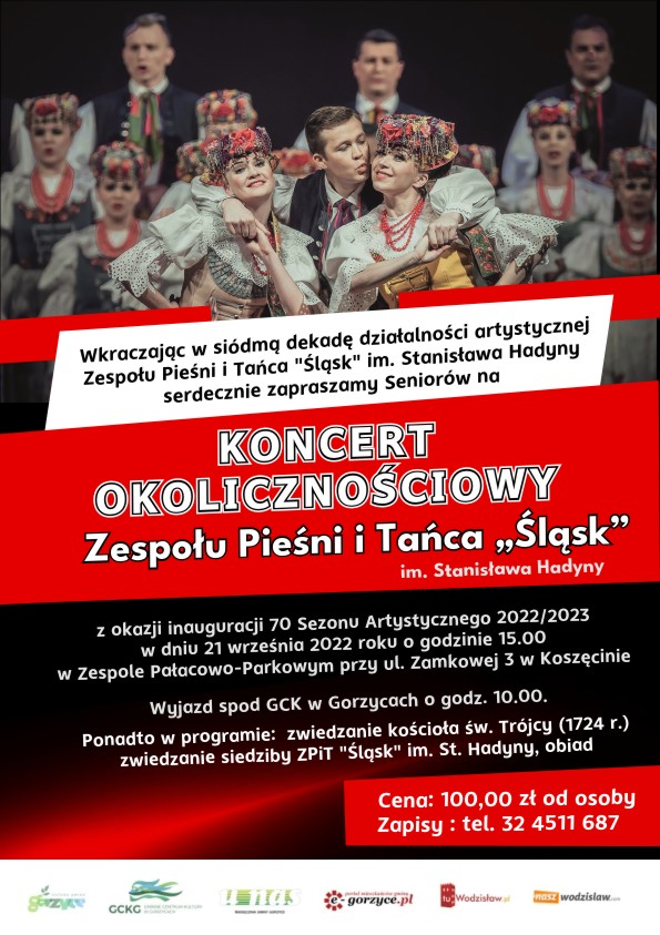 Koncert odbędzie się w dniu 21 września 2022 roku w zespole pałacowo-parkowym w Koszęcinie przy ulicy Zamkowej 3. Wyjazd został zaplanowany na godzinę 10.00 spod Gminnego Centrum Kultury w Gorzycach. W programie wyjazdu, prócz koncertu znalazły się także: zwiedzanie kościoła pw. Świętej Trójcy oraz zwiedzanie siedzimy ZPiT Śląsk. Przewidziany został także obiad.