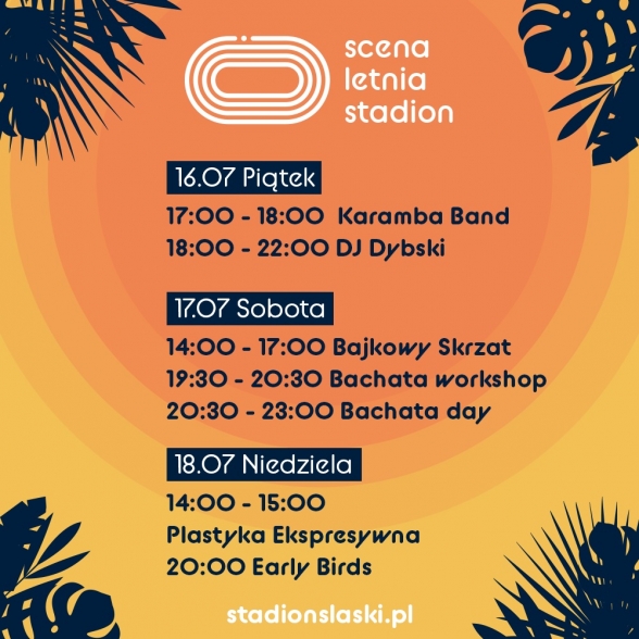 Strefa Sceny Letniej Stadionu Śląskiego została zlokalizowana na terenie obwodnicy wokół obiektu, a wszyscy chętni mogą wejść do niej za darmo przez bramę nr 3. Wśród atrakcji zaplanowanych na najbliższy weekend znalazły się m.in. zajęcia taneczne, w tym darmowa lekcja bachaty, zajęcia plastyki ekspresywnej dla dzieci z Zaczarowanym Ołówkiem oraz występy zespołów Early Birds i Karamba Band. Nie zabraknie też animacji dla najmłodszych i setów DJskich.