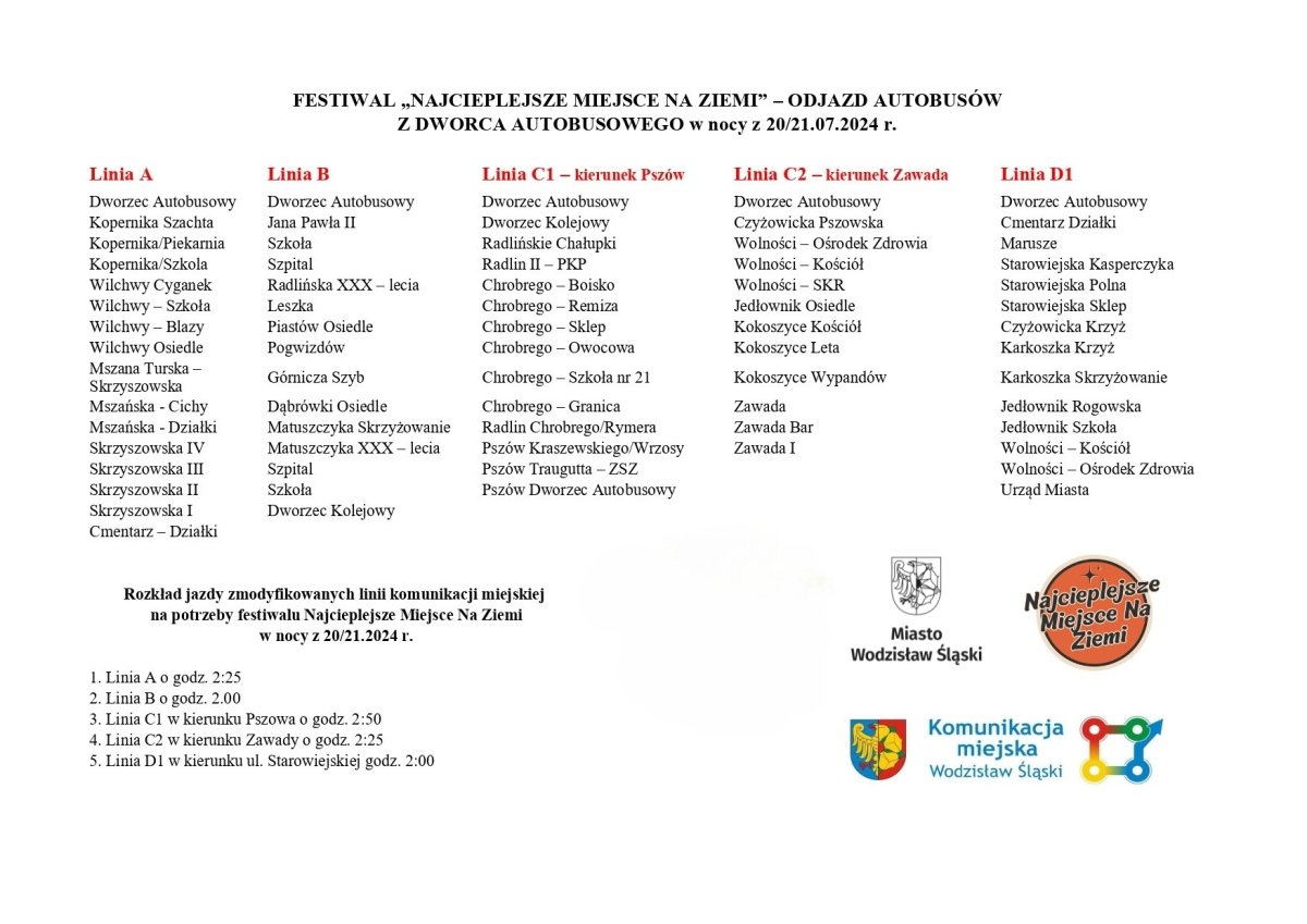 Specjalny rozkład jazdy komunikacji miejskiej na festiwal Najcieplejsze Miejsce Na Ziemi w nocy z 20 na 21 lipca: