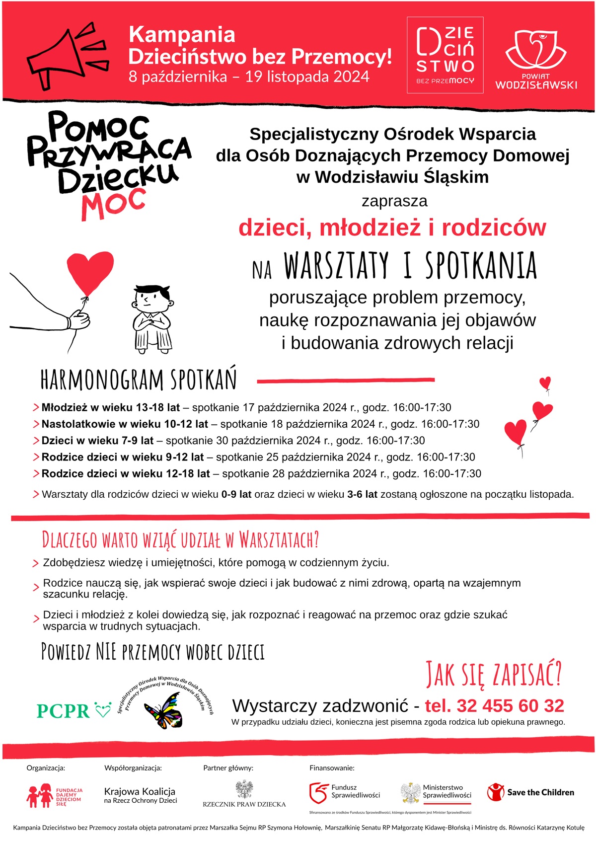 Warsztaty są doskonałą okazją, aby zdobyć wiedzę i narzędzia, które mogą pomóc w codziennym życiu rodzinnym. Rodzice nauczą się, jak budować zdrowe i wspierające relacje z dziećmi, jak reagować na trudne sytuacje oraz jak wspierać emocjonalny rozwój swoich pociech. Dzieci i młodzież dowiedzą się, jak rozpoznawać objawy przemocy, jak reagować oraz gdzie szukać pomocy, jeśli znajdą się w sytuacji zagrożenia. Udział w warsztatach jest bezpłatny, co czyni je jeszcze bardziej dostępnymi dla wszystkich zainteresowanych. Zachęcamy do szybkich zapisów, aby skorzystać z tej unikalnej możliwości.
