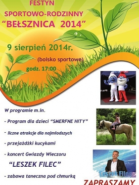 W imieniu organizatorów zapraszamy 9 sierpnia br. na Festyn sportowo - rodzinny "Bełsznica 2014". Impreza odbędzie się na boisku sportowym o godz. 17.00. W programie m.in.: program dla dzieci "smerfne hity", liczne atrakcje dla najmłodszych, przejażdżki kucykami, koncert gwiazdy wieczoru - Leszka Filca